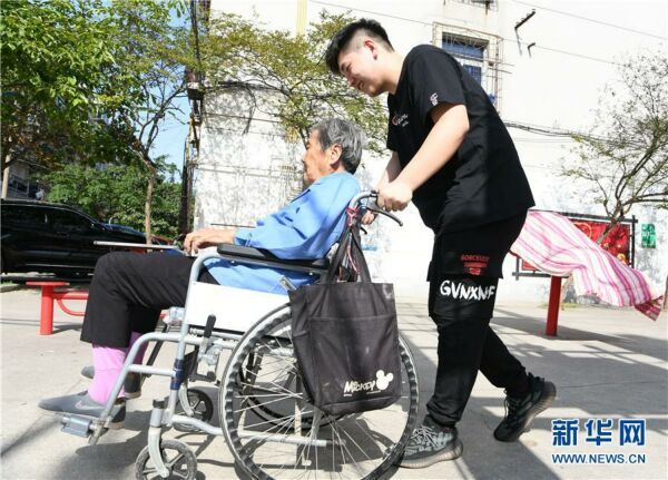 5月9日,安徽理工大学第一附属医院“00后”男护士段青龙休息在家,发挥护理特长,志愿帮助社区老人活动身体,宣传健康知识。