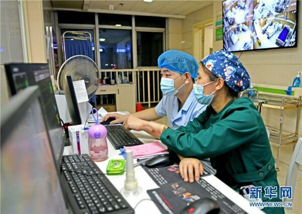 5月10日凌晨,安徽理工大学第一附属医院神经重症监护病房内,夜班中的“00后”男护士段青龙与同事记录电子病历。