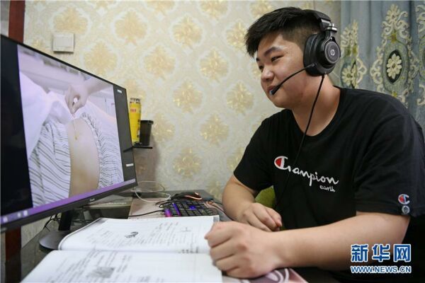 5月9日,安徽理工大学第一附属医院“00后”男护士段青龙休息在家,通过视频教学,学习护理知识。