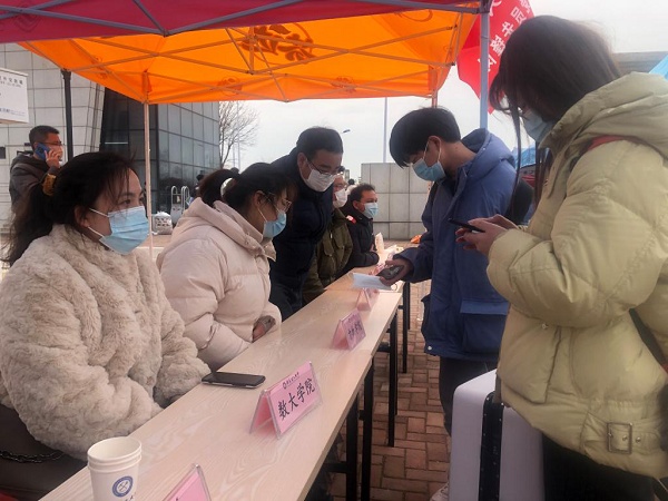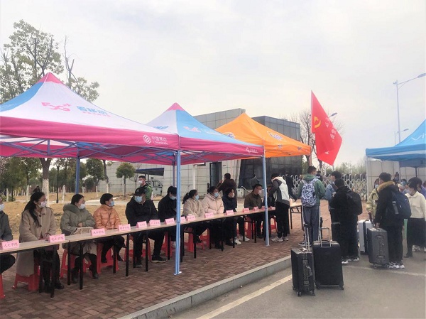 学工队伍、研工队伍、保卫处、后勤保障处、校医院等部门的工作人员在南门入校通道迎接学生归来,按照“应检尽检、不漏一人”的原则,执行体温检测、健康码核验、返校码核验、核酸检测阴性证明核验、口罩更换等入校程序。学生志愿者们协助开展入校核验程序,帮助同学们提行李、引导学生入校。