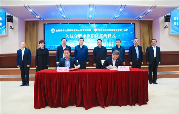 庐阳区委副书记、区长陈伟与安徽理工大学校长袁亮代表双方签约;李建刚、袁亮、凌云、单虎共同为安徽理工大学高等研究院(合肥)揭牌。
