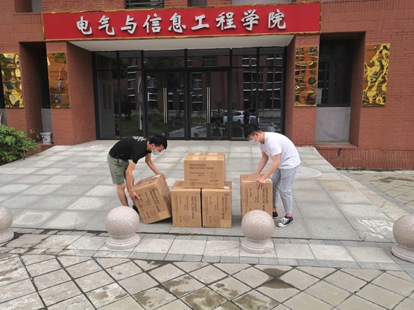 承载着感恩之情的五箱口罩到达学院(摄影:吕加乐)