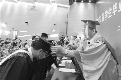 在现场,身穿学位服的博士毕业生、硕士毕业生、本科毕业生代表依次走上主席台,由与会校领导为他们授予学位、扶苏拨穗。该校身在各地的2020届毕业生们也通过“云端”相聚,共同为自己的大学时光画上圆满的句号,在母校的嘱托中,开启人生新篇章。