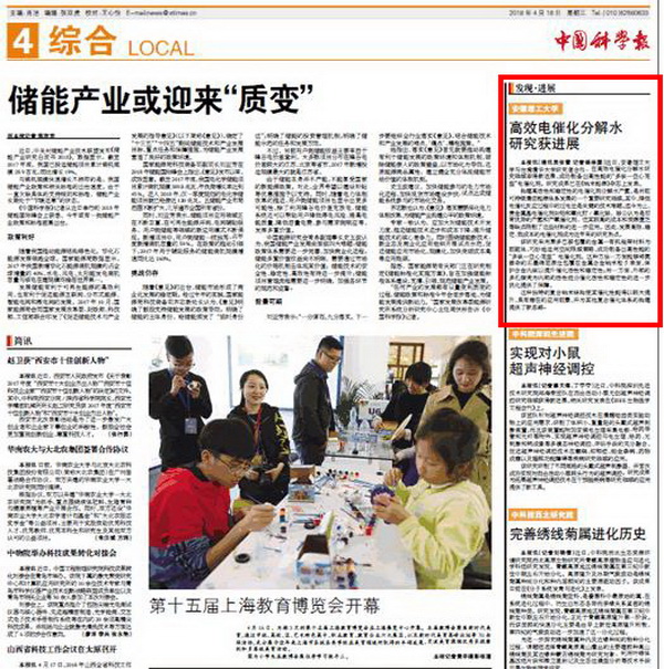 本报讯(通讯员张雷 记者杨保国)近日,安徽理工大学与台湾清华大学研究者合作,在高效电催化分解水研究领域取得新进展,成功制备出高性能的“多核—空心笼型”电催化剂。研究成果已在《纳米能源》杂志上发表。