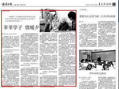 在安徽理工大学,有一个专门从事帮扶老人的学生志愿团体,这就是以该校化学工程学院学生为主体的暖阳爱老学校。自成立以来,爱老学校的志愿者们入社区、进农村、访问养老院,开展各类帮扶老人公益活动达300余次,参与人数3000余人,并与一些患病老人、空巢老人结成固定帮扶对子,长期为老人们送去亲人般的温暖与关怀。