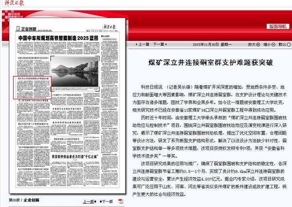 历时近十年时间,由安徽理工大学牵头承担的“煤矿深立井连接硐室群围岩扰动效应与控制技术”项目,围绕深立井硐室群围岩扰动效应及演变规律进行深入研究,揭示了煤矿深立井连接硐室群围岩扰动机理,提出了优化空间布置、合理间距等设计方法,研发了系列新型支护结构形式,解决了以往设计方法缺少针对性、硐室群支护结构单一等多项技术难题,该项目获授权发明专利7项,并获“安徽省科学技术进步奖”一等奖。