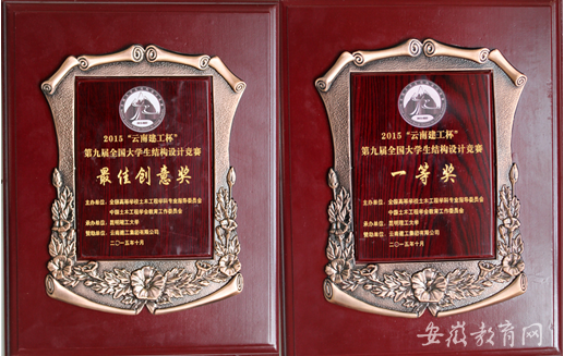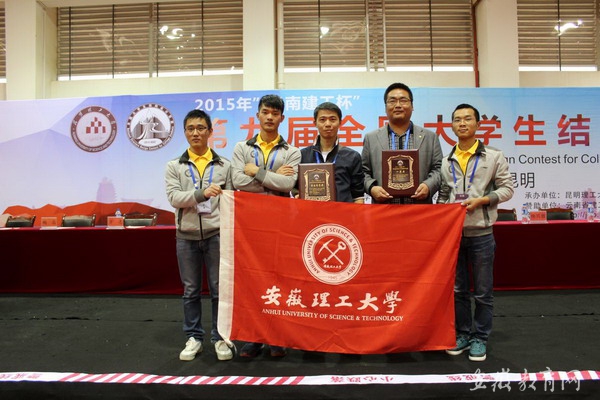 10月15日至18日,第九届全国大学生结构设计竞赛在昆明理工大学举行。安徽理工大学代表队——“筑梦战队”力挫群雄,斩获“一等奖”,并获得大赛唯一的“最佳创意奖”,刷出了安徽省高校“最佳创意奖”的首获记录。此次包括清华大学、哈尔滨工业大学、同济大学等建筑老八校在内的109所高校、110支队伍,共计330名土木工程类专业大学生参加了竞赛。