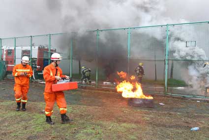 上午九点十八分,尖锐的防空警报声在安徽理工大学校园上空骤然响起,学校5000名学生冒雨从宿舍、教室等各个方向快速向操场撤离。5分钟内,全部安全、有序地疏散到指定区域。随后,现场进行了灭火、抢救伤员等自救互救模拟演练。