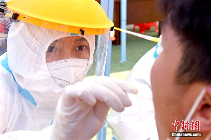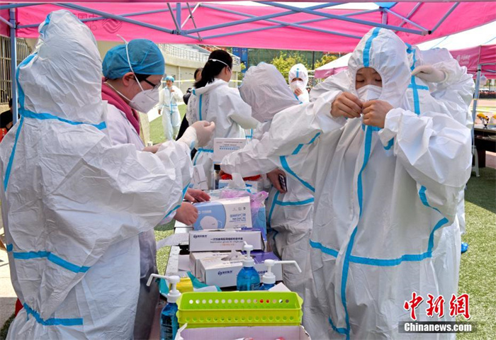 4月6日,安徽理工大学第一附属医院医护人员在操场上为安徽理工大学32000余名师生进行第六轮全员核酸检测。截至4月6日24时,淮南市报告本地确诊病例9例,目前在院治疗9例;尚在医学观察的无症状感染者333例。图为安徽理工大学第一附属医院党员医护人员冲锋在前。 陈彬 摄