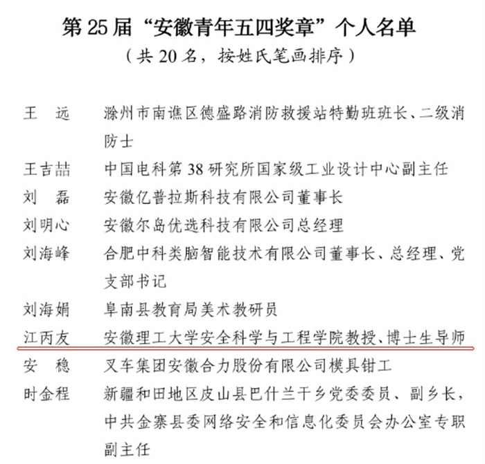 日前,根据团省委消息,安徽理工大学安全学院青年教师江丙友获评第25届“安徽青年五四奖章”。