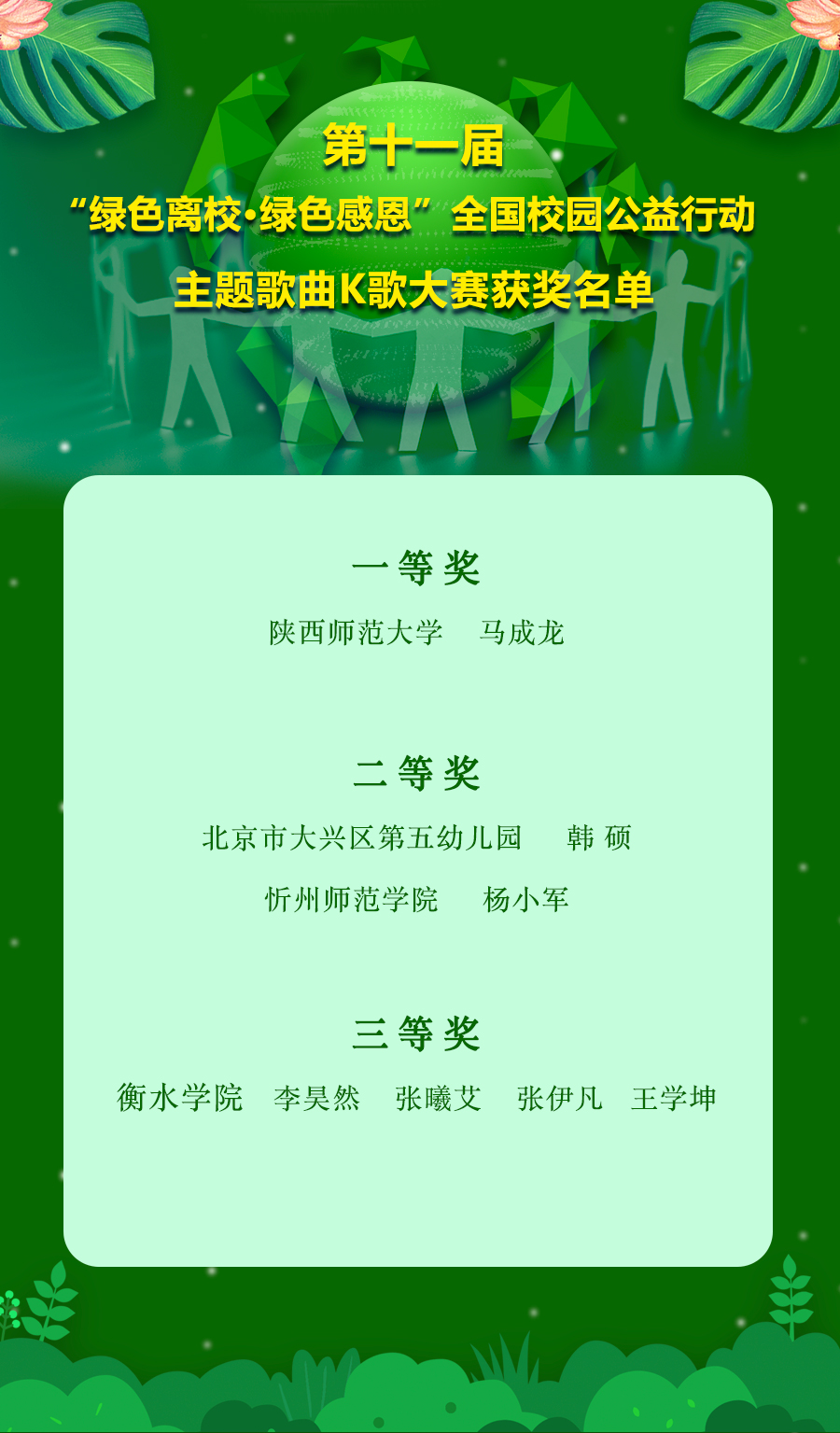 根据对项目主题、执行力度、成果展示、关注热度、线上点赞量等方面的综合评比,焦作市第十二中学绿意环保社团等26个社团获得“优秀社团”称号,安徽理工大学刘阳等144位同学(含主题歌曲大赛7名获奖者)获得“优秀志愿者”称号,李红香等11位协调员获得“优秀协调员”称号,现将本届活动各项获奖名单公布如下: