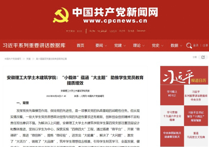 近日,在全国第六届基层党建创新典型案例征集活动中,安徽理工大学土木建筑学院《“小载体”蕴涵“大主题” 助推学生党员教育提质增效》党建创新活动入选全国第六届基层党建创新典型案例专题展示,并在人民网·中国共产党新闻网进行专题展示。
