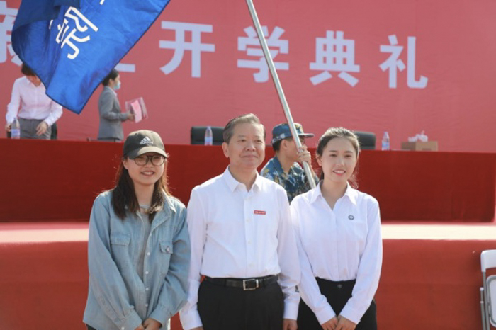 开学典礼在全场师生庄严的国歌声中拉开序幕。“淮水泱泱,淮山苍苍,北挽黄河,南携长江;求真务实,追求卓越,志存高远,天道路长......”伴随着校歌《大学无疆》慷慨激昂的旋律,护旗手们擎着1500平米的巨幅校旗从新生方阵中穿过,当校旗经过每一位新生的头顶上方时,大家激动地高举双手触摸校旗,共同感受身为安理人的这份光荣。
