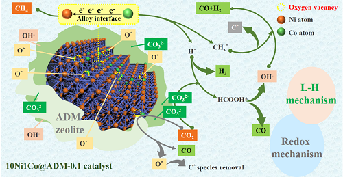 “结果显示,沸石封装层有利于稳定性、富缺陷镍-钴合金结构的形成,并且镍-钴合金结构促进了富电子Ni金属位的形成,进而显著提高了甲烷碳氢键断裂能力。另外,沸石层表面碱性位点和金属位点的协同作用提高了二氧化碳分子的吸附/活化以及其与积炭前体作用转化为一氧化碳的过程,从而在延长催化剂使用寿命的同时仍能高效催化甲烷干重整反应。”王一双说。