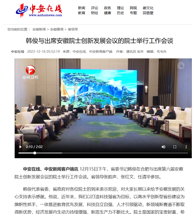 何多慧、杜江峰、施蕴渝、陈鲸、袁亮、王运敏、俞汉青、张久俊、吴信东、陆亚林、金双根、方明、谷俊杰、熊健等院士表示,安徽科技实力强,创新活跃强劲,将充分发挥专业所长,积极对接安徽发展所需,在创新平台建设、科技成果转化、产业转型升级、人才引进培养等方面深化合作,为安徽高质量发展贡献力量。