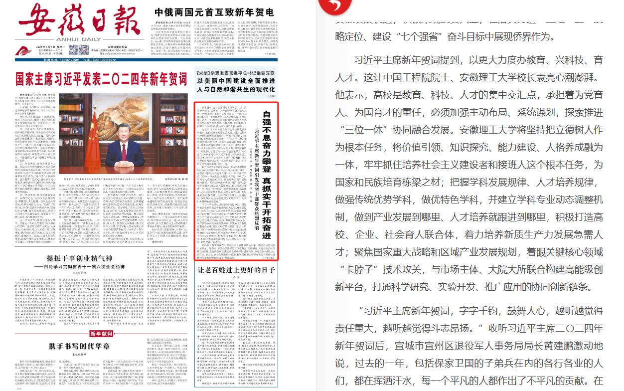 新年前夕,国家主席习近平发表了二〇二四年新年贺词,在全省广大干部群众中引发热烈反响。大家表示,习近平主席对过去一年动情描述,对未来一年深情寄语,让人倍感温暖、备受鼓舞。新的一年,要更加紧密地团结在以习近平同志为核心的党中央周围,自强不息、奋力攀登,真抓实干、开拓奋进,加快建设现代化美好安徽。