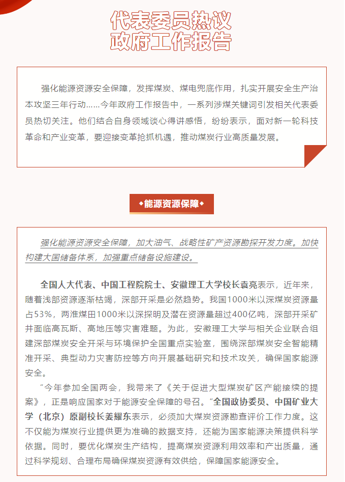 “今年参加全国两会,我带来了《关于促进大型煤炭矿区产能接续的提案》,正是响应国家对于能源安全保障的号召。”全国政协委员、中国矿业大学(北京)原副校长姜耀东表示,必须加大煤炭资源勘查评价工作力度。这不仅能为煤炭行业提供更为准确的数据支持,还能为国家能源决策提供科学依据。同时,要优化煤炭生产结构,提高煤炭资源利用效率和产出质量,通过科学规划、合理布局确保煤炭资源有效供给,保障国家能源安全。