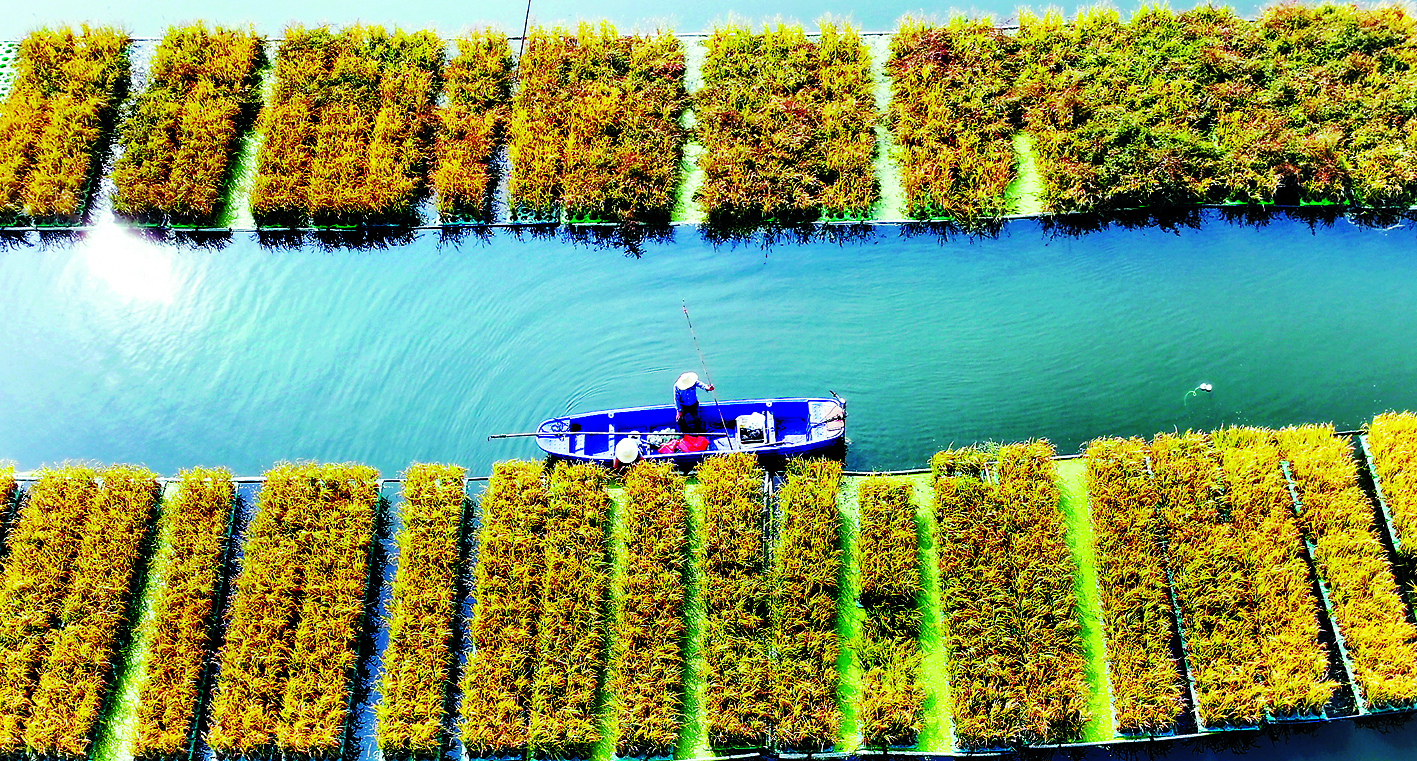 工人在顾桥镇采煤沉陷区收割浮床水稻