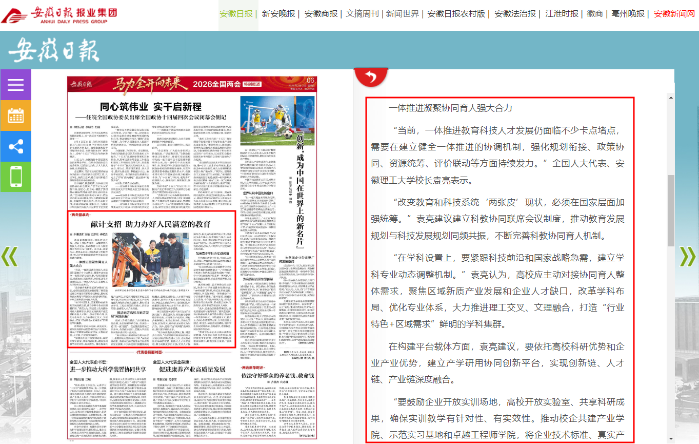 “当前,一体推进教育科技人才发展仍面临不少卡点堵点,需要在建立健全一体推进的协调机制,强化规划衔接、政策协同、资源统筹、评价联动等方面持续发力。”全国人大代表、安徽理工大学校长袁亮表示。