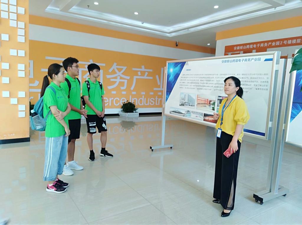 8月12日,实践团抵达蚌埠的安徽蚌山跨境电子商务产业园进行参观学习。安徽蚌山跨境电子商务产业园是网商聚集、服务聚合、创新整合,搭建跨境平台,培育优势企业,形成电子商务集群发展,具有蚌埠地方特色的电子商务全产业链综合服务园区。参观过程中,实践团一行通过观看宣传片、展板介绍、平台演示以及工作人员的讲解等形式深入了解产业园发展情况,并了解了产业园目前的运营、招商、基础设施配套等情况。工作人员向实践团介绍了产业园的发展和未来的利好趋势,同时带领实践团参观产业园内的企业。实践团成员们认真记录着参观心得,并不时向工作人员提出相关疑问,园区工作人员一一作了解答。
