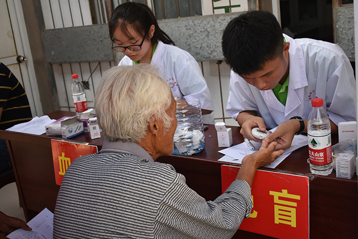 在淮南市医院2名医生的协助下,团队在淮南市朱集村党群服务中心开展了“义检暖心,健康传递”医疗援助活动。义务体检,测血糖、量血压、检查视力……,穿上白褂的志愿者们化身白衣天使为村民服务,简单的体检表上虽项目有限,但志愿者们却没有忘记印上健康常识,提醒村民关爱生命;医生坐诊,内科外科分开咨询,长长的咨询队伍说明了村民的需求,志愿者们则一直陪伴左右,体贴交谈,用耐心和微笑宽慰着现场的每一名群众。