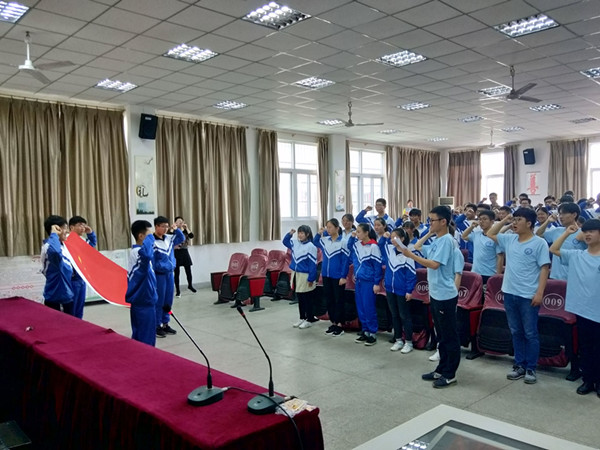 新老团员面对团旗庄严宣誓,老团员为新团员佩戴团徽。淮南二十中九年级新团员代表袁成福同学作了发言。