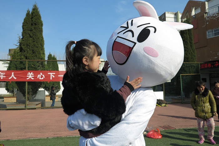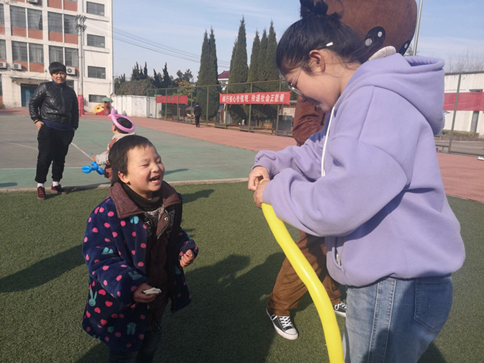 活动当天,志愿者们将带来的糖果、饼干等食品分发给在场的每一位小朋友,并将气球折成小狗和小兔子等动物形状分发给大家。小朋友们牵着五颜六色的气球在教室里边跑边笑,其乐融融,宛如亲切和谐的大家庭。同时,在老鹰抓小鸡、投篮比赛中,孩子们个个大显身手,与志愿者们一起嬉戏,快乐的笑容洋溢在每个孩子的脸上,欢乐的气氛充满了整个校园。最后,志愿者们向孩子们发放学习、生活和体育用品等,活动在与孩子们依依不舍的“再见”声中结束。