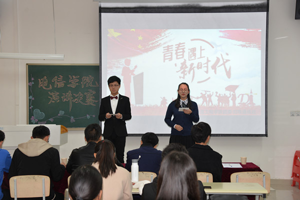 经过学院初赛,共有10名选手脱颖而出,入围决赛。选手们结合新时代背景和日常的学习生活,从身边着眼,从小处着手,充分挖掘和歌颂身边优秀青年的先进事迹和感人故事,拥抱新时代,砥砺新担当,实现新作为。电气18-5班选手孙祝元同学,旁征博引,引经据典,条分缕析地论证了“青春是拿来奋斗的”的观点,雄厚有力,激昂振奋。电子18-1班选手陈凡,别树一帜,从“创新”角度切入,发表《让活力与创新碰撞》主题演讲,抑扬顿挫,声情并茂,用极富表现力的肢体语言和神态感染了在场的每一位观众。比赛中,选手们或激昂高亢,或低沉吟颂,用真情歌颂了新时代以来取得的非凡业绩,抒发对美好青春的热烈向往,表达了对实现中华民族伟大复兴中国梦的坚定理想信念。