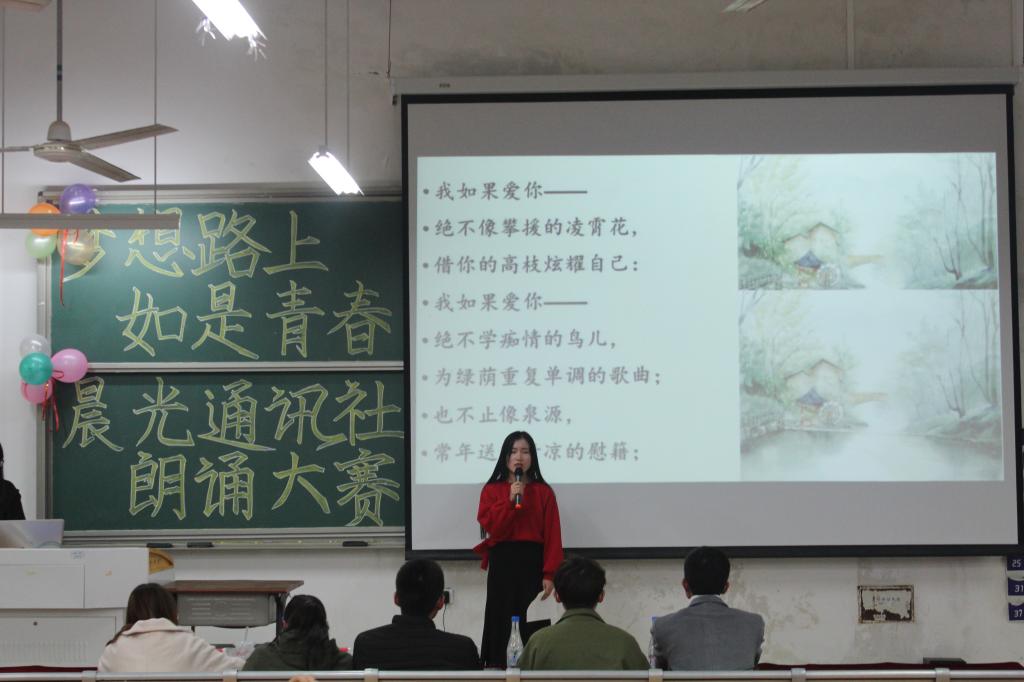 11月24日,经济与管理学院于天工106教室举办了“梦想路上,如是青春”新生朗诵比赛。经管学院2018级各专业的20余名同学参加此次比赛。