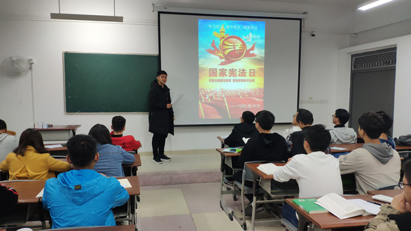 18级机电中外班在天工北507教室举行主题班会,由班长讲解宪法内容和作用、意义等,其他同学各自发表观点感悟,营造了学习宪法的氛围;机电18-1、2班在天工105教室举办宪法知识问答活动,以抢答形式进行,同学们还现场分享发生在自己身边的宪法小故事,引导学生由知法向懂法、守法、用法迈进;过控18-1、2班在明理南205教室开展模拟法庭活动,由学生分别饰演审判长、书记员、原告、被告等角色,结合搜集的素材生动再现了现场开庭情况,活动通过表演形式使同学们积极学法、懂法。