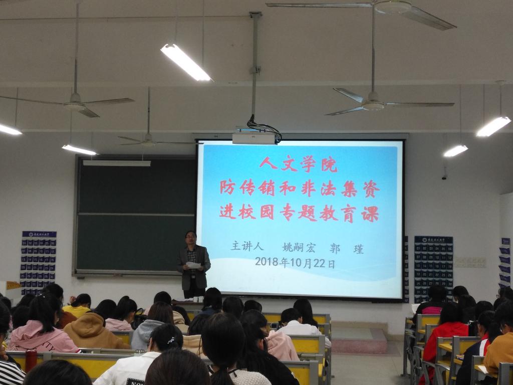 10月22日晚,人文学院在天工南216教室开展防传销和非法集资进校园专题教育活动,学院2018级全体大一新生参会,由姚嗣宏、郭瑾老师主讲。