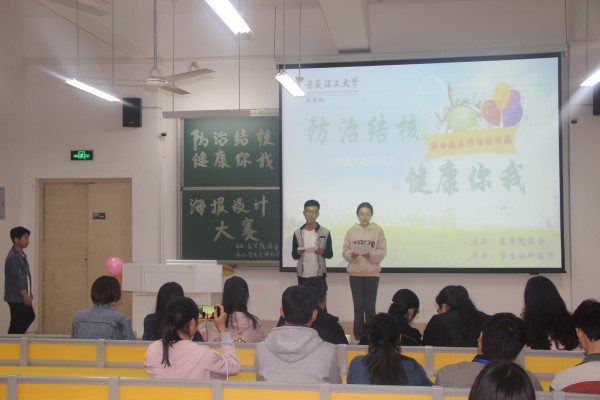 “防治结核 健康你我”海报设计大赛。3月30日晚,医学院团委在明理204举办了“防治结核 健康你我”海报设计大赛,学院2017级近300名新生观看了比赛。赛前,选手们以“防治结合 健康你我”为主题,自由发挥设计宣传海报。现场,参赛选手分别从各自团队作品的主题、设计理念、灵感来源等方面全面诠释了作品。15个参赛作品各有特色,选手孔令琪组运用了动画片的元素以及制作过程的视频,活灵活现地展示了她们的作品;选手汪君瑶组设计的海报以图为主,以文为辅,并以柔和的黄、绿、蓝三色为主色,让人不禁眼前一亮。