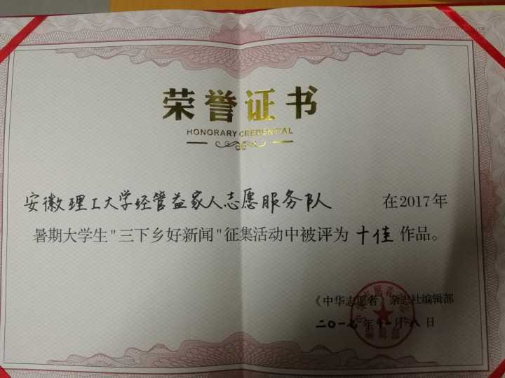 近日,由《中华志愿者》杂志社、中国公益新闻网联合主办的2017年暑期大学生志愿服务“三下乡好新闻”征集活动获奖名单公布,我校经济与管理学院益家人志愿服务队凭借新闻稿件《安理工学子走近留守儿童:让大手牵起小手》被评为“三下乡好新闻”十佳获奖团队。