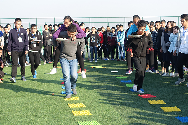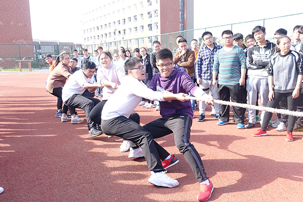 本次趣味运动会以班级为单位展开,共设有五个项目:“无敌风火轮”、“楚汉之争”、“疯狂的蜈蚣”、“徒步荆棘路”和“小马过河”。 “无敌风火轮”项目,要求每队将报纸粘贴到一起,做成一个大纸圈(风火轮),每队队员需要站到自己的风火轮上,向前移动,抵达终点;“楚汉之争”活动项目中,同学们通过拔河的形式,“寸土”必争,毫不退让;“徒步荆棘路”活动项目中,男女同学合作,走过指压板,踏过杂乱无章的小板凳冲向终点……各班同学全力拼搏,相互配合协作,尽自己最大努力完成各项目的考验,为班级荣誉而战。呐喊声、加油声响彻现场。