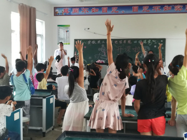 “请把我的歌带回你的家,请把你的微笑留下……”一阵阵欢快的歌声从临泉县杨小村徐老小学的教室里传出来,这是安徽理工大学电气与信息工程学院的大学生志愿者们在给留守的小朋友们进行音乐课。7月6日-10日,大学生志愿者们利用暑假时间赴国家贫困县临泉县滑集镇杨小村为当地的留守儿童开设特殊的田园课堂。