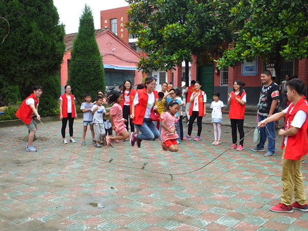 为了筹备此次活动,志愿者们精心部署,认真备课,准备了小朋友喜欢的玩具、文化用品和体育器材等,保证课堂的顺利进行。此次田园课堂共有23名志愿者“老师”为当地的93名留守小朋友授课,课堂共有体育、美术、音乐和科学四类课程,深受孩子们的喜爱。体育课上,小朋友们开心的跳大绳,进行背夹球竞赛,玩的不亦乐乎;美术课上,小朋友奇思妙想,用水笔勾勒出多彩的花园;音乐课上,小朋友们跟着音乐翩翩起舞,像精灵般唱响大自然的乐章;科学课上,一只只不会扎爆的气球勾起了小朋友的好奇心,一颗渐渐浮到水面的鸡蛋引起了孩子们的无限遐想。