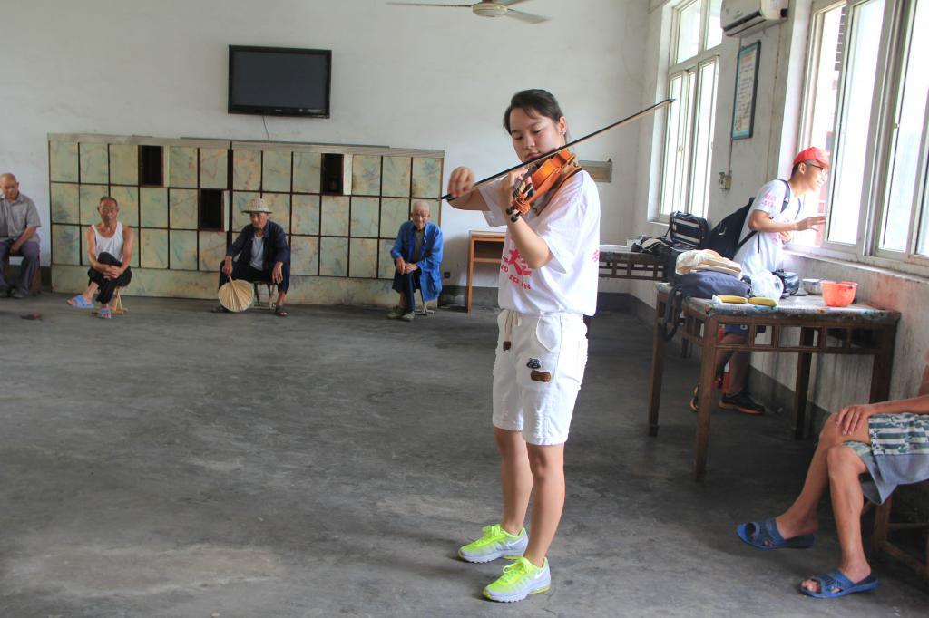 志愿者们有的陪老人坐在树荫下,听老人畅聊过去的故事,有的陪老人在院子里散步,听老人介绍这里的一草一木,有的和老人一起在电视机前观看新闻,听老人说说党和他们的故事。谈话之余,志愿者们将带来的西瓜、香蕉等水果分发给老人们。对于行动不便的老人,志愿者们将水果送进了他们的房间。接着志愿者为老人们表演了精心准备的节目,小提琴曲《渔舟唱晚》、校歌《大学无疆》、老歌《枉凝眉》、手语舞《国家》轮番上场,让老人们赞不绝口。最后,志愿者们为老人清扫了院子和房间,让老人们生活的更舒适。