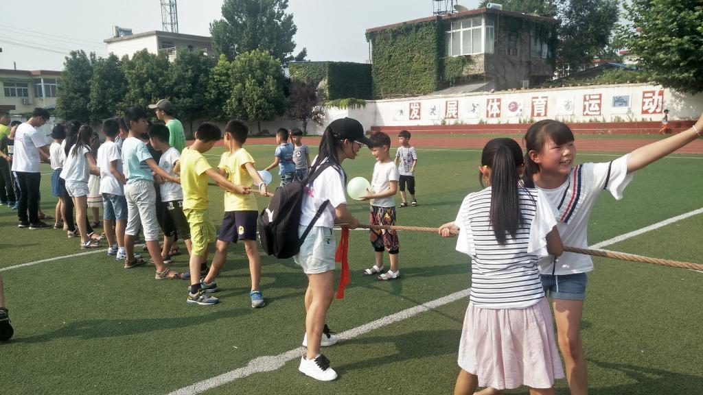 接着,志愿者带领小朋友们开展了户外素质拓展活动。活动分为两人背对背夹气球、两人三足捆腿跑和集体拔河比赛两个环节进行。活动通过多人合作的形式来培养朋友之间的默契和信任,珍惜友情。在拔河比赛环节,志愿者们负责组织工作,鼓励小朋友们积极参与。小朋友们分成2队比拼,发扬了勇于挑战、友谊第一的比赛精神。操场上喝彩声不断,整个校院充满了青春的活力。