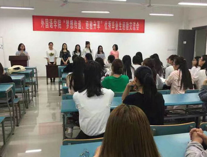 6月2日晚,外国语学院在崇智楼B235教室举行了“梦想传递、经验分享”优秀毕业生交流会。2017届毕业生袁萍、陈卫等6名同学与70余名学弟学妹分享了学习经验与心得体会。