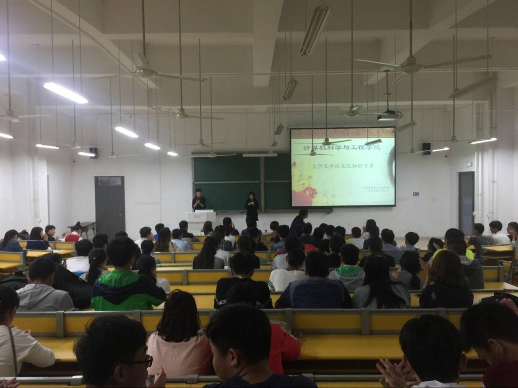 为弘扬传统文化,展示青春风采,5月5日,计算机学院在明理楼103举办中国传统文化知识竞赛。院党委副书记蒋群、各年级辅导员及全院百余名学生观看了比赛。