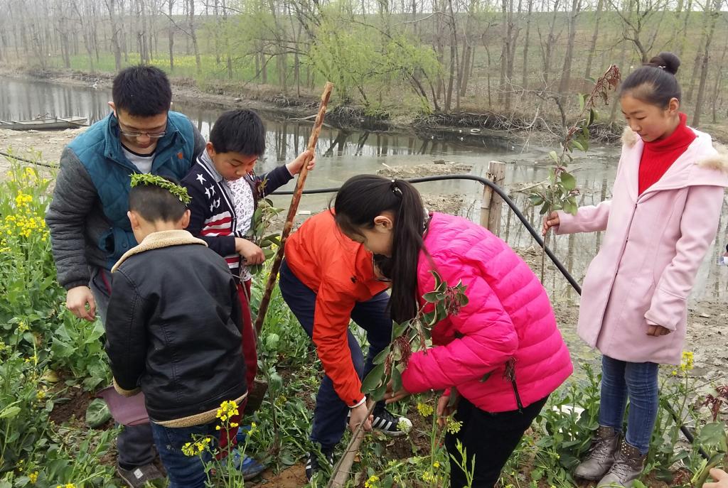 随后,志愿者将留守儿童带至植树场地,进行合理分组,并以小组为单位领取植树工具以及树苗。大家有条不紊地进行植树活动,挖坑、放树苗、埋土、提水、浇水,留守儿童们按照所学习到方法认真完成植树步骤。植树过程中,志愿者与孩子们热情洋溢,互相帮助,团结合作,将一棵棵鲜嫩的树苗种入绿地。