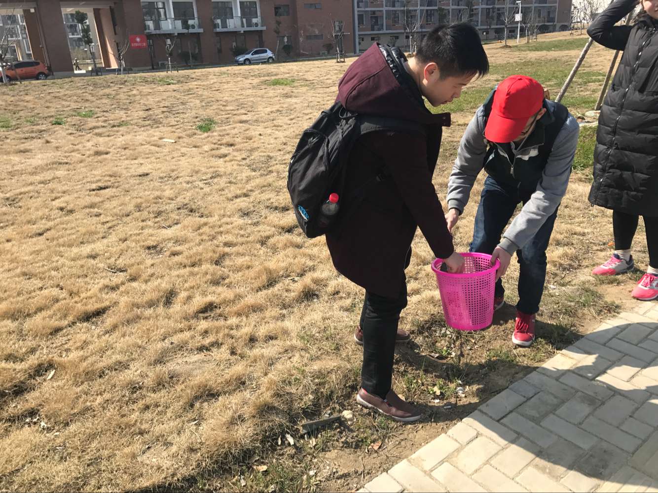 志愿者们在校园内捡垃圾(摄影:王雨倩)