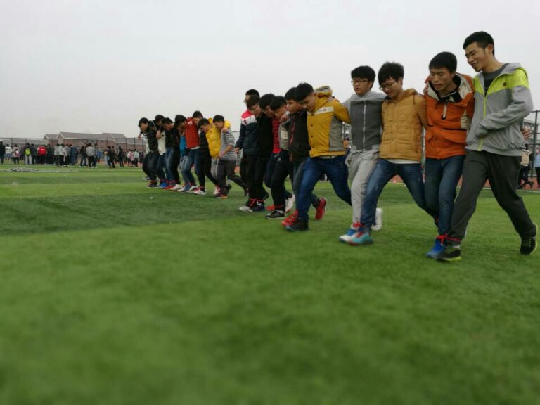 本次素质拓展训练中共设计了十人九足、地雷阵挑战和团队拔河比赛等3个训练项目,每个训练项目都要求团队成员开动脑筋、统筹安排、齐心协力才能够完成。在十人九足比赛中,同学们相互搀扶,踏着整齐的步伐,向着终点齐步迈进,“一二一”的口号伴随着同学们欢快的笑声响彻整个操场。在地雷阵挑战项目中,被蒙住双眼的选手在场外选手的指引下挑战场区中的“地雷障碍”,随着比赛的顺利进行,彼此的信任和默契也在逐步加深。在拔河比赛中,同学们团结一致,齐心协力,为班级的荣誉而奋力拼搏,加油呐喊声弥漫在整个赛场。