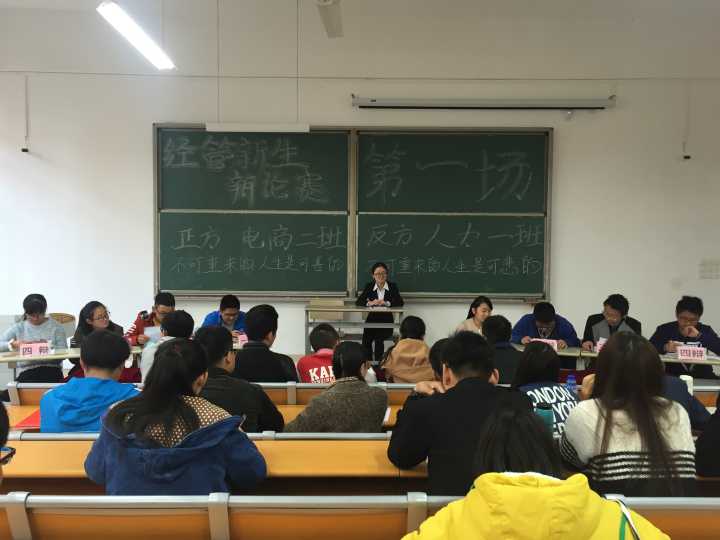 为培养新生的思辨力,拓展知识面,11月6日上午,在山南新区天工南102教室,经济与管理学院2016级新生赛半决赛与决赛拉开帷幕。经过为期三周的激烈角逐,共有四个班级代表队入围本届新生辩论赛半决赛。院学生会主席张靖漪,院学生会副主席张超逸,经管院辩论队队长陈巍莅担任评委。