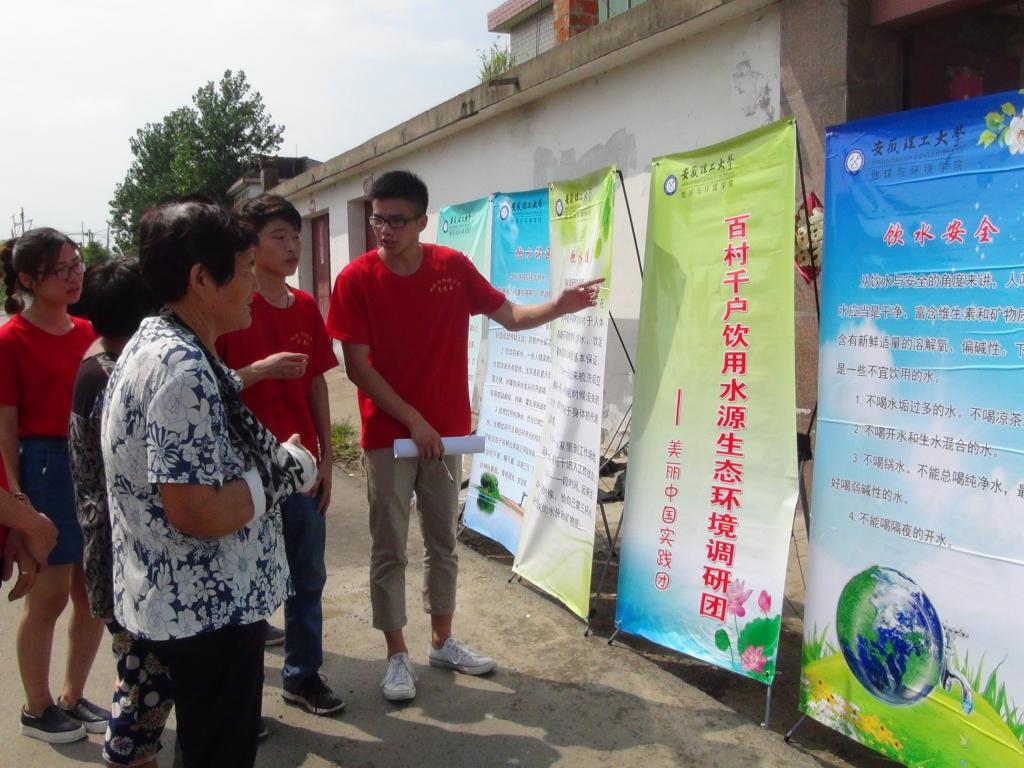 地球与环境学院“百村千户”饮用水源生态环境调研团,是2016年学校重点实践团队,目前团队120名成员,已分布到安徽各县村陆续开展活动。