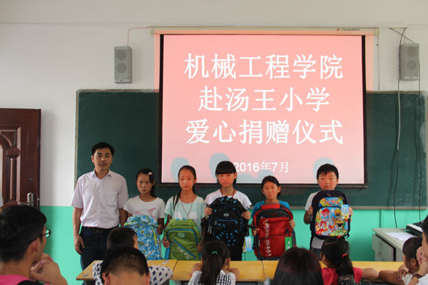 15日,社会实践团队来到谢家集区杨公镇汤王小学开展爱心帮扶活动。志愿者们为留守儿童捐助了爱心书包、传统文化系列漫画图书,向小学生们宣传普及了假期防溺水、防火、防电以及交通安全等安全常识,通过播放视频形式讲解了假期安全的重要性。志愿者还为小学生播放了我校新校区视频宣传片,鼓励他们努力学习,将来走进大学殿堂。在教室外,志愿者为小学生带来了精心准备的文艺节目,小学生和大哥哥大姐姐一起欢呼雀跃,现场情意浓浓。在户外操场,组织小学生开展“老鹰捉小鸡”、“单足赛跑”等一系列游戏,学院航模协会成员还为小学生带去了航模飞行器的表演与科技知识介绍。