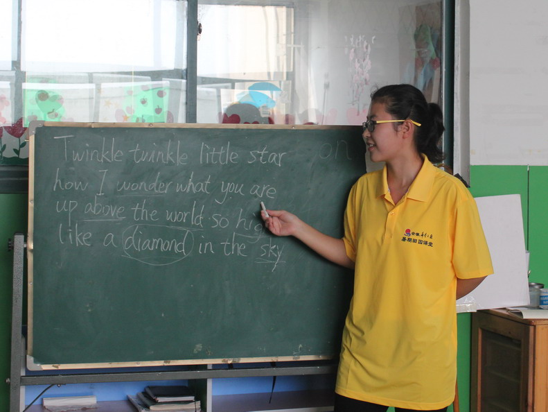 7月15日上午,淮南市潘集区贺疃镇中心幼儿园的教室里, 38名三、四年级的小学生们安静地坐着,不断地向外眺望,他们正焦急地等待着他们暑假的新老师——十名外国语学院“‘童’一个梦”义务支教团队的大学生志愿者们。