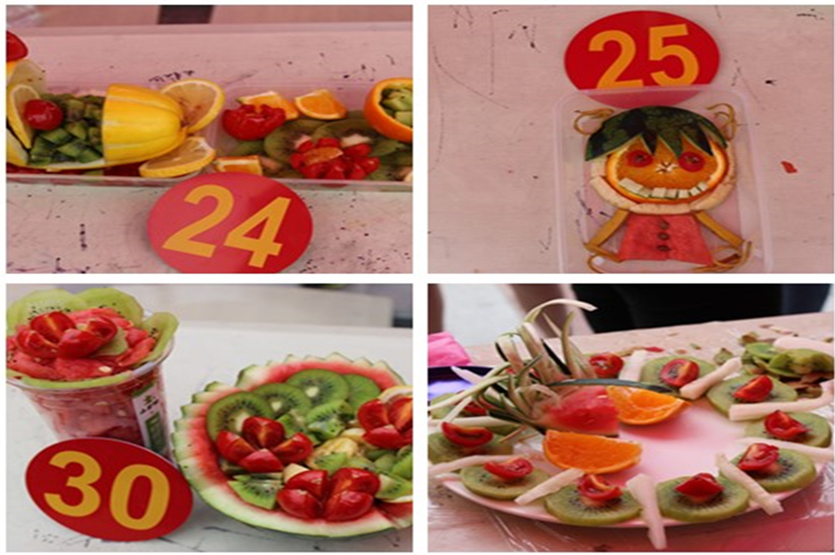 在紧张而谨慎地挑选水果种类之后,选手们开始了他们的创意之旅。参赛选手们各显神通,有的用手中的小刀雕刻着图案,有的用自己的巧手将原本混乱的苹果片、圣女果等拼成大大的笑脸,有的则用西瓜做成了一杯清爽可口的西瓜汁。在小组成员的精心设计和团结合作下,一个个富有新意的水果拼盘映入眼帘。