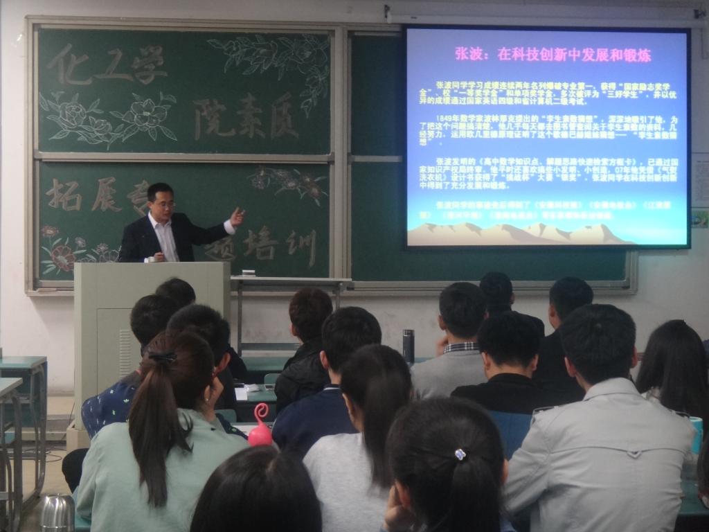 4月8日晚,化学工程学院在北实204教室举办以“激情成就梦想,拼搏铸就未来”为专题的素质拓展专题培训会。学院辅导员纪旭担任主讲。会议由院团委副书记杨志华主持。