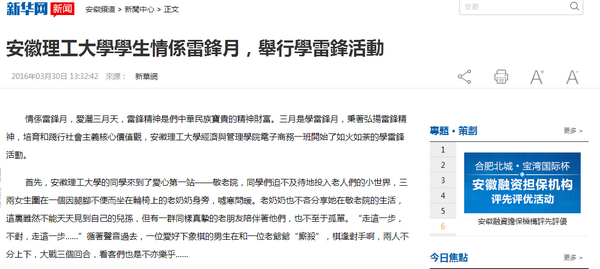3月30日,新华网以《安徽理工大学学生情系雷锋月,举行学雷锋活动》为题报道安徽理工大学经管学院学雷锋志愿服务活动。